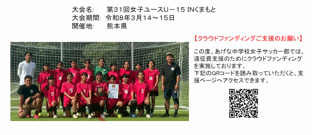 あげな中学校女子サッカー部|県大会優勝!熊本での県外大会へ挑戦する子どもたちを応援!